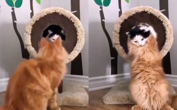 Пушистого героя этого видео сильно возмутило то, что хвостатый брат забрался в его домик. Черно-белый кот явно не собирался уходить добровольно, и тогда рыжий котейка решил выселить его. Он обхватил шею брата и буквально выдернул его из домика одним ловким движением.