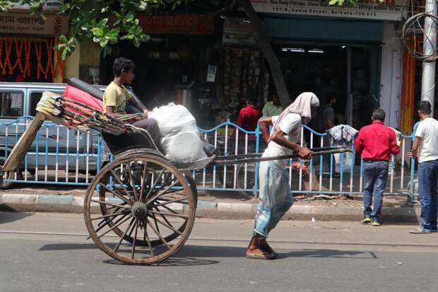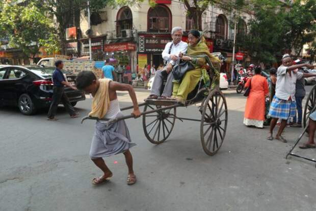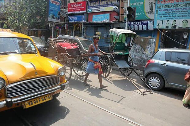 Фантастика, но в наше время есть места, где можно прокатиться на коляске, в которую запряжена не лошадь. а обычный человек! Это город Калькутта — крупнейший мегаполис Индии. Суровые крепкие парни таскают пассажиров практически в буквальном смысле на своём горбу.